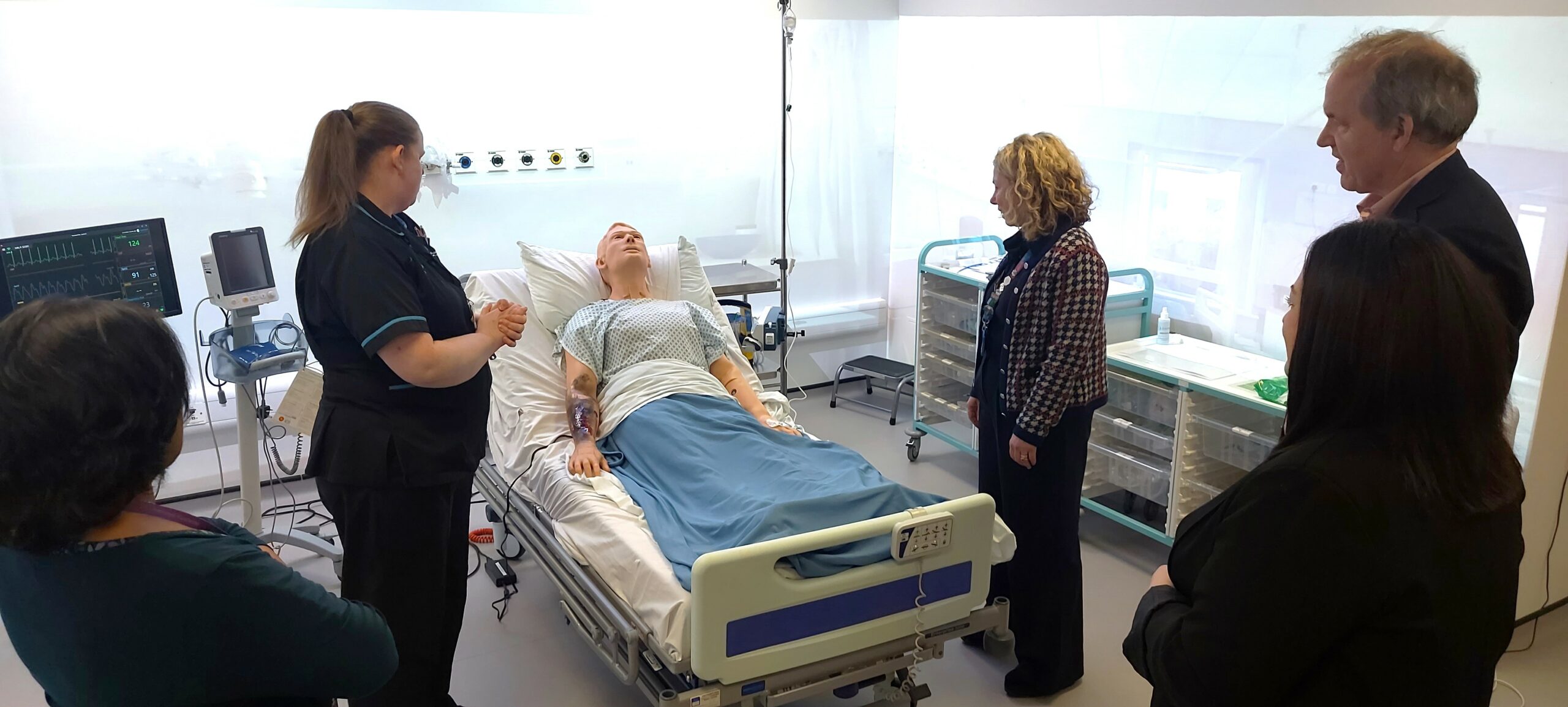 The day began with an engaging discussion between Professors Ivison, Hallam, and Kingston and our Undergraduate Team. The conversation highlighted the strengths of our programme while also addressing the key challenges our students encounter. Following this, the visitors were given a guided tour of the Simulation and Skills Department in Health Academy Two, where they met some of the eerily life-like ‘patients’ sim models, that are used for students’ immersive learning experiences.
